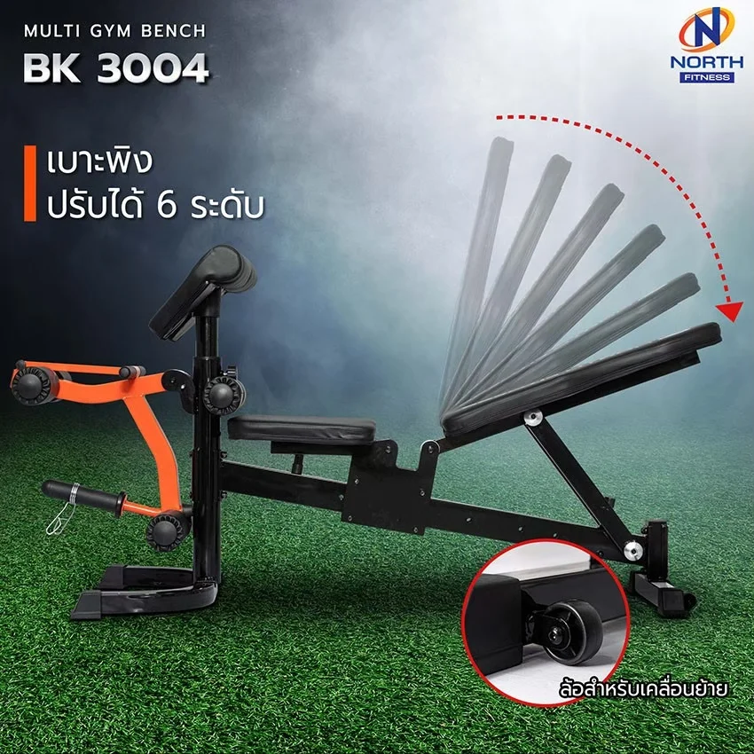ม้านั่งปรับระดับ North fitness รุ่น BK3004 MULTI GYM BENCH คือ ม้านั่งบริหารอเนกประสงค์ ที่ออกแบบมาเพื่อการฝึกฟรีเวทที่หลากหลายและครอบคลุมกล้ามเนื้อหลายส่วนในเครื่องเดียวโดดเด่นด้วย ม้านั่งที่สามารถปรับระดับได้ถึง 6 ระดับ (ทั้ง Flat, Incline และ Decline) โครงสร้างทำจากเหล็กหนาได้มาตรฐาน ทำให้มั่นใจในความแข็งแรงและทนทานสูงฟังก์ชันเสริมที่ครบครัน:มี แกนเหล็กด้านหน้าสำหรับใส่แผ่นน้ำหนัก (Plate-Loaded) ซึ่งช่วยให้ผู้ใช้สามารถฝึก กล้ามเนื้อหน้าแขน (Biceps Curl), ขาด้านหน้า (Leg Extension) และ ขาด้านหลัง (Leg Curl) ได้อย่างมีประสิทธิภาพมาพร้อม เบาะรองหน้าแขน (Preacher Pad) ที่สามารถปรับระดับได้ 4 ระดับ เพื่อการฝึก Biceps ที่แม่นยำเบาะหนา 5 ซม. หุ้มด้วยหนังคุณภาพดี ป้องกันการขีดข่วน พร้อม ล้อ สำหรับใช้เข็นเคลื่อนย้ายได้สะดวก และ ยางรองเครื่อง เพื่อยึดเกาะพื้นนี่คือม้านั่งอเนกประสงค์ที่สมบูรณ์แบบ มอบทั้งความแข็งแกร่ง ความหลากหลายในการฝึก และฟังก์ชันเสริมสำหรับกล้ามเนื้อแขนและขา