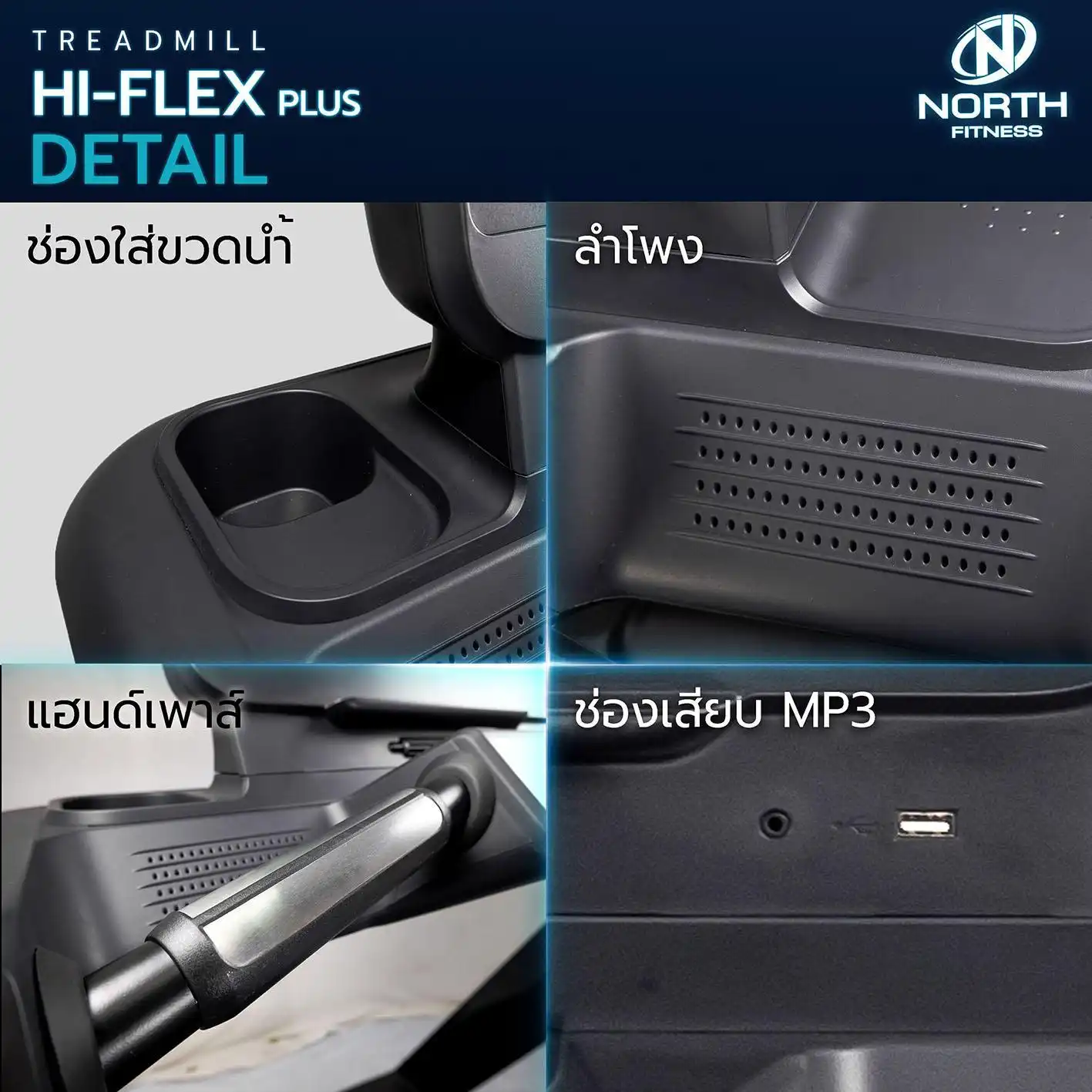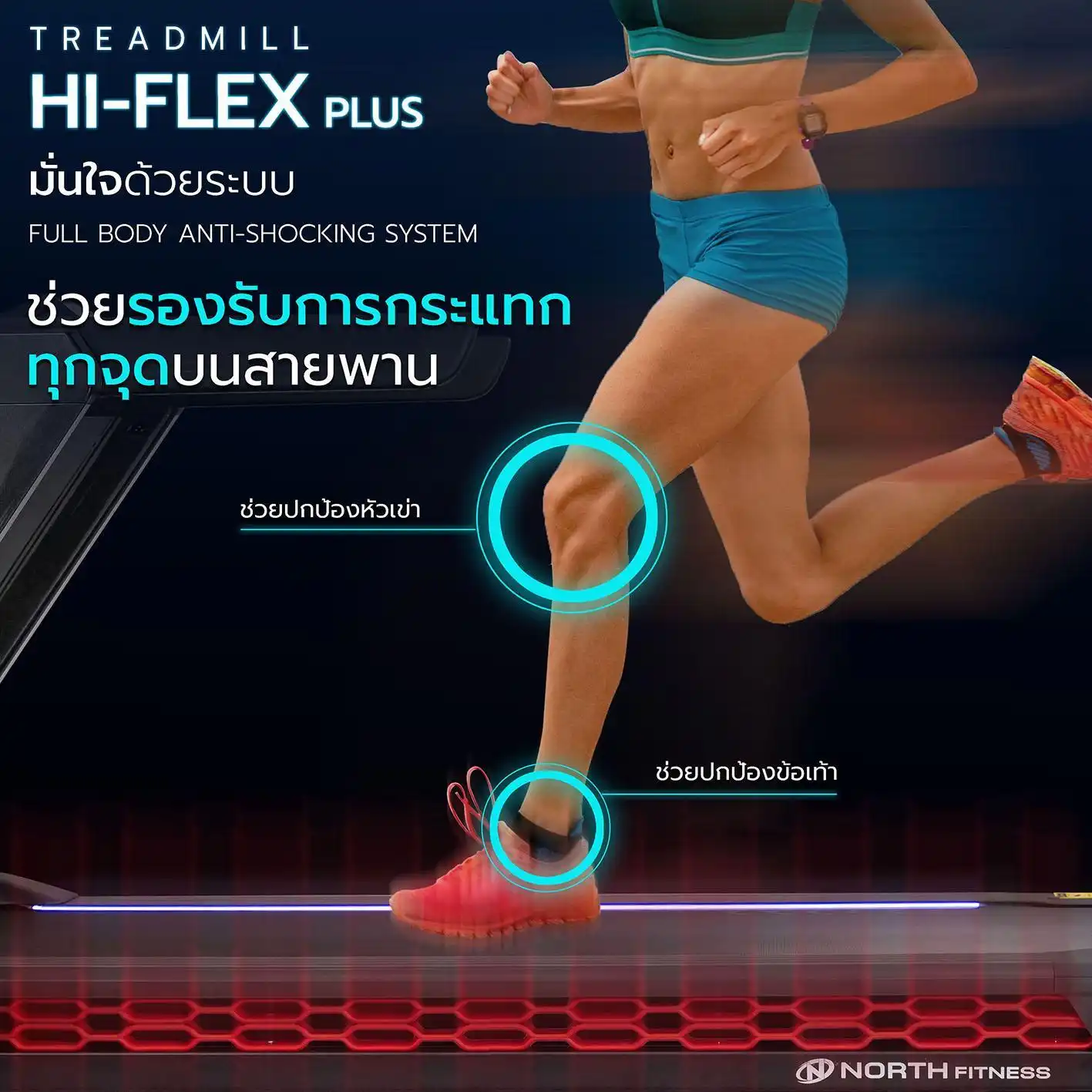 ลู่วิ่งไฟฟ้า North Fitness รุ่น Hi-Flex Plus คือ ลู่วิ่งไฟฟ้า ระดับ Commercial Grade ที่รวมดีไซน์หรูเข้ากับสมรรถนะสูง มอเตอร์ AC Peak 7 HP ให้พลังวิ่งที่ต่อเนื่องไม่มีสะดุด ความเร็วสูงสุด 20 กม./ชม. และปรับความชันไฟฟ้า 18% ตอบโจทย์การฝึกซ้อมระดับนักกีฬาโครงสร้างทำจากเหล็กหนาแข็งแกร่ง ทำสีเมทัลลิกเกรดรถยนต์ รับน้ำหนักผู้ใช้ได้สูงสุด 180 กก. ด้วยพื้นที่วิ่งกว้าง 58 x 157 ซม. พร้อมระบบรองรับแรงกระแทกเต็มตัว ช่วยปกป้องหัวเข่าและข้อเท้าได้อย่างมีประสิทธิภาพหน้าจอ LED แสดงผลข้อมูลครบถ้วน พร้อมระบบเชื่อมต่อ Zwift Run และฟังก์ชันอำนวยความสะดวกครบครัน ทั้ง ชาร์จไร้สาย, ช่อง MP3/ลำโพง และพัดลมระบายอากาศ ดีไซน์สวยงามด้วย ไฟ LED ใต้ที่พักเท้านี่คือลู่วิ่งสมรรถนะสูงที่ออกแบบมาเพื่อการใช้งานหนักต่อเนื่อง มอบทั้งกำลังเครื่อง ความทนทาน และดีไซน์ที่ลงตัว